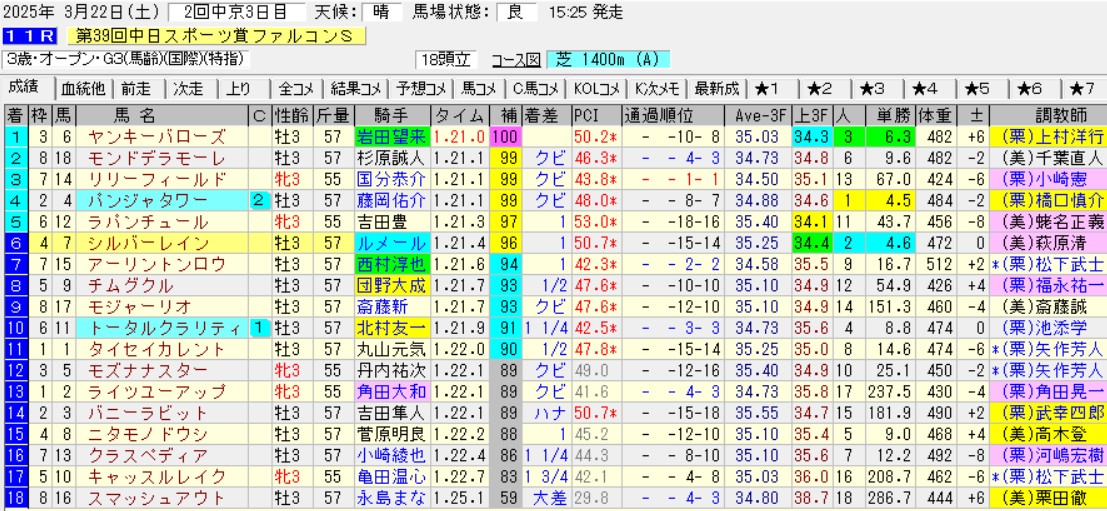 京王杯2歳Sで先着許した1着パンジャタワーはNHKマイルC(G1)優勝、3着ヤンキーバローズはファルコンSを勝った。2着マイネルチケットは1番人気の豊明S(3勝)で4着に敗れ、仲秋S(3勝)はラヴァンダのアタマ差2着。こう考えると2勝クラスで負ける理由はないか。