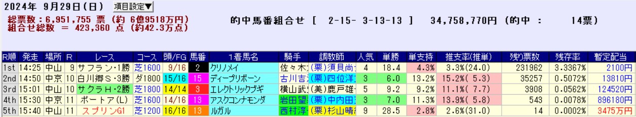 それでも買い目を見たら最後をルガル1点で仕留めてて恐れ入った。ああいうのは単に金にモノをいわせて当てたとは言えない。ただ大金を使えばいいだけじゃないのも見えて面白いね。