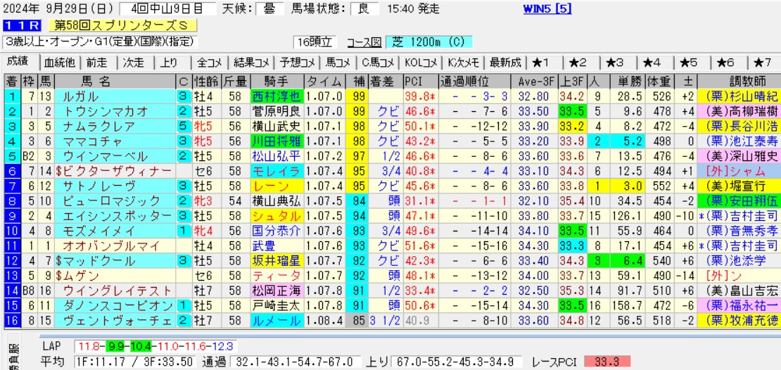 ところが中山の高速馬場の影響で前がそう簡単に止まらない。慌てた連中が追い出したときは時すでに遅し。「勝てる位置」で競馬をしていたルガルに勝利が舞い込んだ。超ハイペースのように見えて出走各馬の上がりは、16頭中10頭が33秒台、34秒台4頭、35秒台2頭の内訳だった。