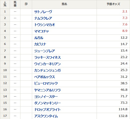 参考までに某キチガイ掲示板の予想オッズを見てみたところ、下馬評はサトノレーヴが他馬を大きくリード。以降はいつものメンバーといったところか。