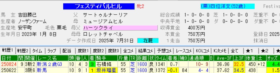 「ポジションは後ろになりましたが、終いの脚はしっかりしていました。距離は1600mぐらいで良いと思います」※あのペースで前に行けない理由はない。乗れるようになった望来にしてはガッカリ。