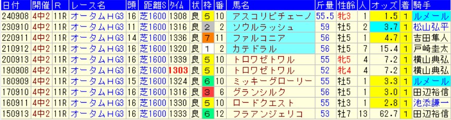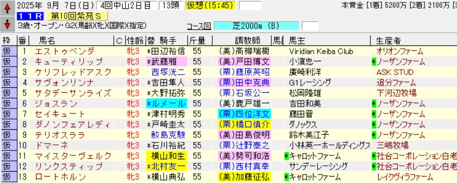 これまではオータムハンデ(G3)だったのが、今年から番組改悪の関係で紫苑S(G2)へ切り替わった。比較的予想しやすかった伝統の一戦から、力関係の読みにくい3歳牝馬の秋華賞トライアルへの変更は厄介だ。