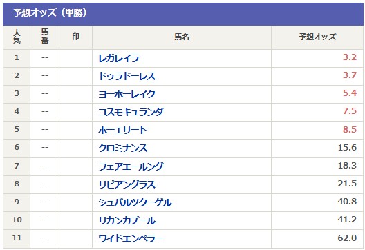 参考までに某キチガイ掲示板の予想オッズを見てみたところ、2強+3頭+その他の想定。3番人気ヨーホーレイク以降と6番人気想定クロミナンス以降でオッズの谷間が出来ている。