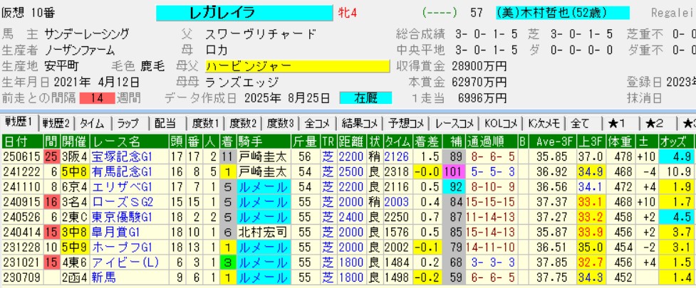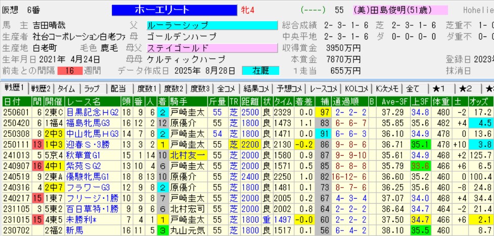 中山以外で馬券に絡んだのは新潟未勝利だけという典型的な中山専用機。安定感がないように見えて中山だけなら【1.4.1.1】の複勝率85.7%と出走メンバーで抜けた数字を誇る。秋天で用はないかもしれないだけに、ここで買わなくてどこで買うって馬である。