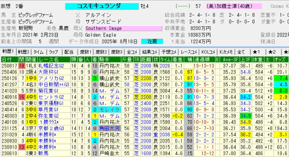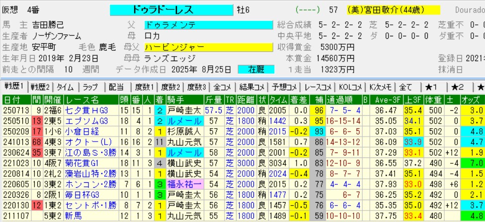 それでも前走の七夕賞(G3)は割といいレースだった。あのときは滅多に見られない柴田大知の神騎乗が凄かったから。切れる脚のない馬で後続の末脚を削る怪ラップでアタマ差残した。このアタマ差というところが道中の微妙な進路取りや仕掛けのタイミングで前後するところであり、モレイラやキングならドゥラドーレスが普通に勝っていたとは思う。