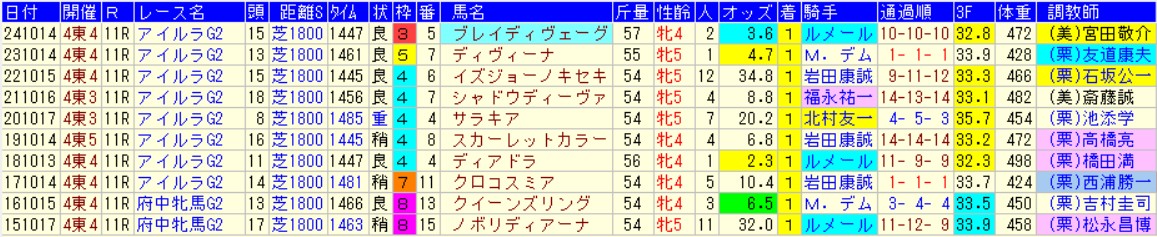 過去10年の結果はこちら。エリザベス女王杯(G1)のステップとしては機能している方といっていいのかどうかは微妙である。