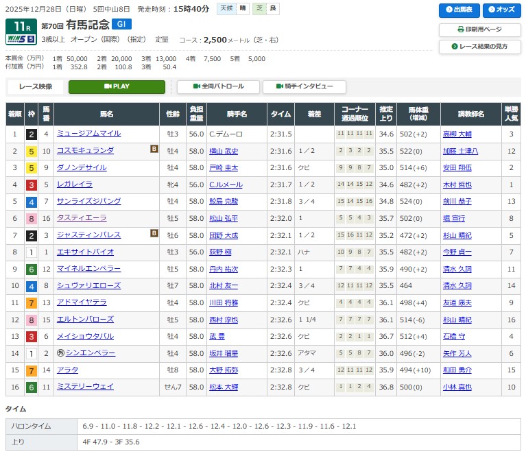 レガレイラ、ダノンデサイル、ミュージアムマイル、メイショウタバルの4頭が単勝オッズ一桁台となった今年の有馬記念(G1)。四強が覇を争った冬のグランプリを制したのは、3番人気に推されたCデムーロ騎乗のミュージアムマイル(牡3、栗東・高柳大輔厩舎)だった。