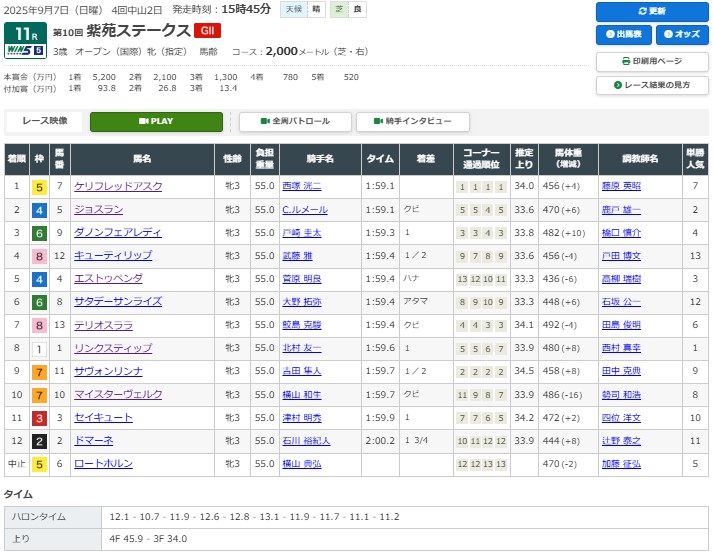日曜中山メインの紫苑S(G2)は、先手を取った西塚洸二の7番人気ケリフレッドアスクが最後まで先頭を譲らず逃げ切り勝ち。秋華賞(G1)の優先出走権を手に入れた。