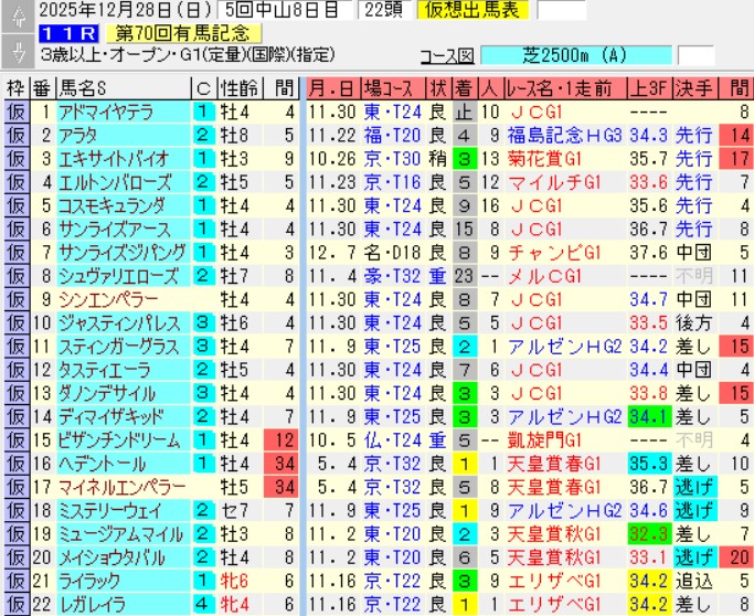 最終的なジャッジは、追い切りや枠順が決まってからとなるが、現時点での想定はこんな感じで考えている。こうやって展望を書きながら予想も半分くらい終わっているのがお約束。楽しい年末を迎えるためにも、しっかりと的中したいレースだね。