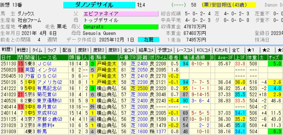 まあそれより気になったのは、実力を出し切って負けたことのないレガレイラに対し、ダノンデサイルは割と力負けをしていること。親子で超スローに持ち込んで展開が最高に向いた昨年の有馬でレガレイラの3着に敗れ、英インターナショナルS(G1)の凡走後に出走したジャパンCで下の世代のマスカレードボールに歯が立たなかった。曲がりなりにもダービー馬がだ。