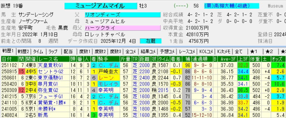 いや、ギャン中専用サイトなのだから馬券的な話をしよう。Twitterをフォローしている人なら察しがついていると思うが、この馬が最有力の見立て。昨年の有馬記念で8枠16番が嫌われて10番人気まで軽視されたシャフリヤールをハナ差2着に持ってきたのがクリスチャン。シャフリヤールより強いミュージアムマイルで割り引く理由にはならない。