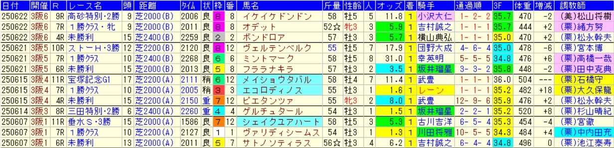 ご覧の通り、6月阪神は高速馬場が収束した後のタイミング。上がりの時計を見れば一目瞭然であり、32秒や33秒の出るレースはひとつもない。この時点でメイショウタバルに、おあつらえ向きの馬場状態が設定されていた訳だ。