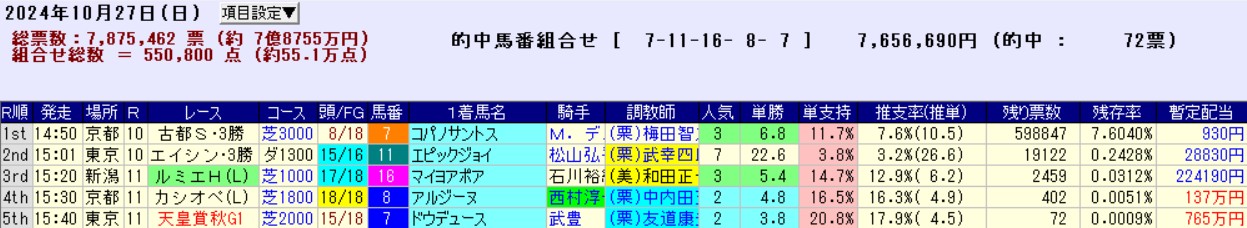 混戦のレースもあったが、目立った波乱もエピックジョイ以外は1レース目の1.7倍ゴルデンスナップを浜中が飛ばした程度。いや、待てよ。秋天の1番人気がドウデュースじゃなかったっぽい。