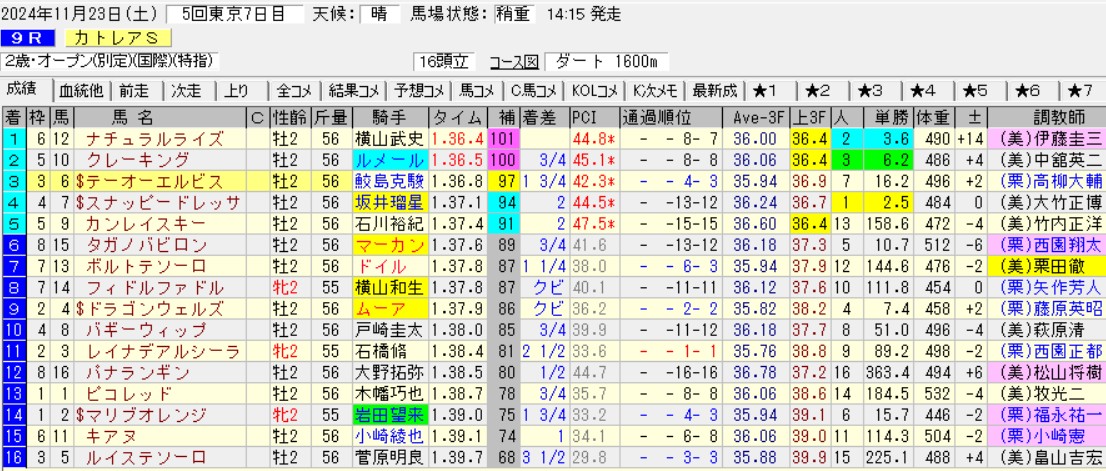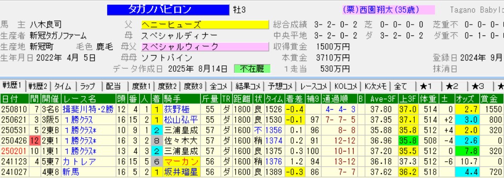 それにしてもこの馬は戦ってきた相手が全く違う。デビュー戦は芝1200mでパンジャタワーの3着に敗れ、ダートに転じた京都の未勝利(ダ1200)を大差勝ち。3戦目は東京のカトレア賞(OP)で3着に敗れたものの、勝ったナチュラルライズは京浜盃(G2)、羽田盃(G1)、東京ダービー(G1)と3連勝した超大物だ。