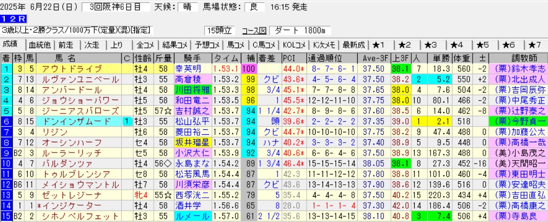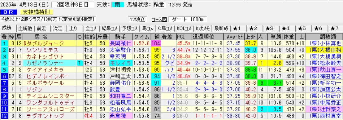 だが、なぜ差し追込み馬が楽勝したかにカラクリがある。だってさ、1着のダブルジョークと2着のシンリミテスが次走からダメダメだもの。つまり、このレースは完全に前潰れであり、展開の味方した馬がハマっただけ。むしろ不利な状況で上位に残した馬が強かったってこと。