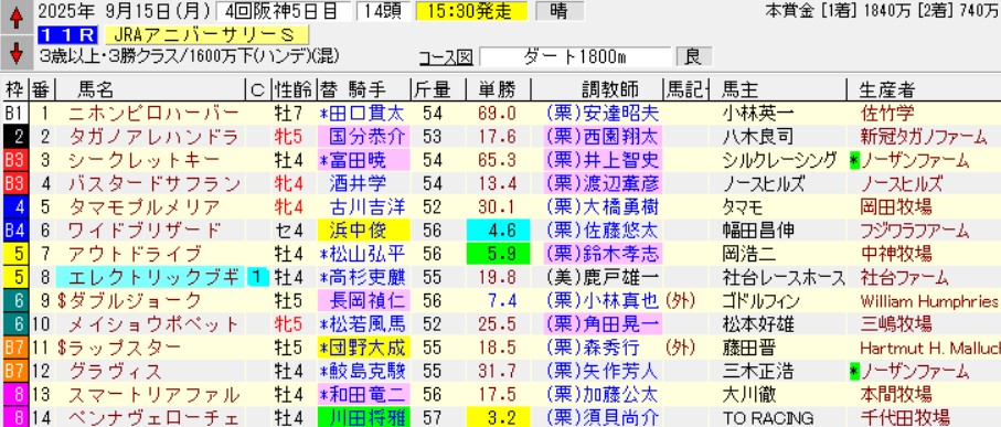 阪神11RJRAアニバーサリーS(3勝)ダ1800