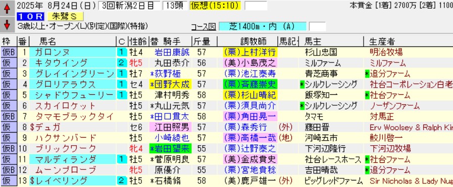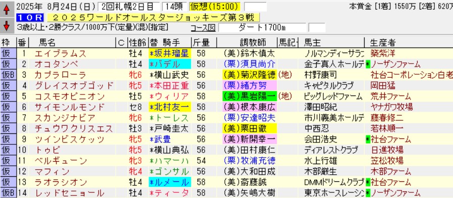 札幌ダ1700mと厄介な条件。過去6回で3番人気以内が5勝を挙げており、比較的平穏なはずだが、昨年は9番人気ティアップリオンが激走した。乗っていたのは武豊で2着オールマキシマムには横山典弘が騎乗。しかも奥平雅士厩舎が2頭出しでワンツー。