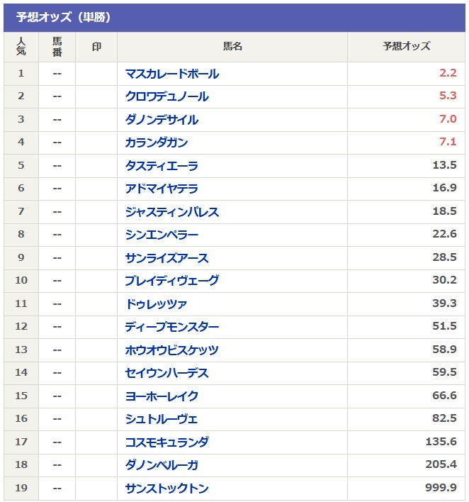 例の如く某キチガイ掲示板の予想オッズを参考にすると、マスカレードボールが1番人気の想定で2番人気にクロワデュノール、3番人気にダノンデサイル、これにカランダガンが4番手で続く。馬場を考えれば上位3頭の争いが濃厚になりそう。