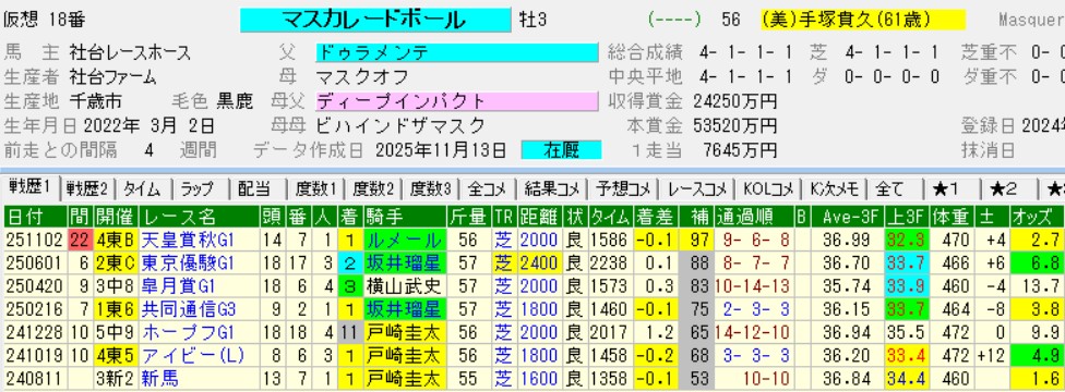 マスカレードボールに直接対決で3戦全勝。相手はホープフルS(G1)でまともに走れる精神状態じゃないまま自滅、皐月賞(G1)は川田将雅エリキングが致命的な不利を与え、ダービーは内前馬場に替わった週で外枠を引いたマスカレードボールの前を外から武豊サトノシャイニングが遮って後方待機を強いられた。