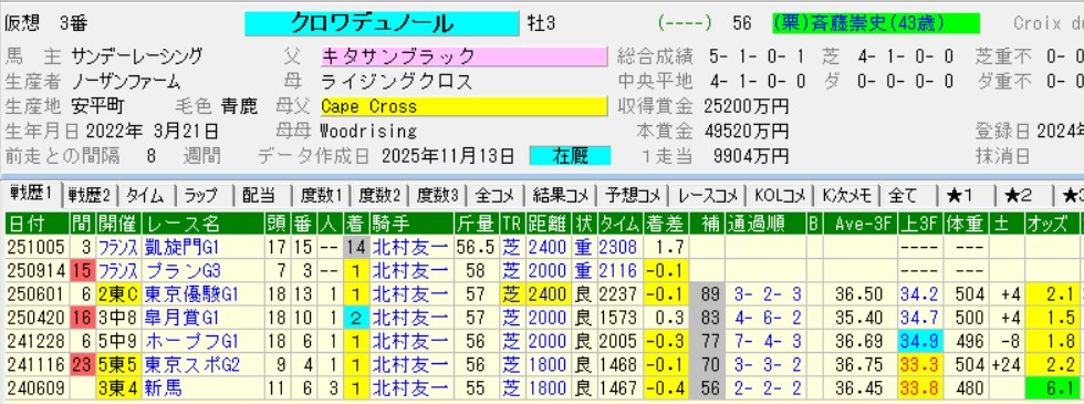 奇しくも今年のクロワデュノールとマスカレードボールも似たような関係だ。フランスで2戦して前哨戦を勝って挑んだ本番で惨敗。中間の併せ馬で格下相手に遅れているように、まだ本調子には戻っていない感じ。