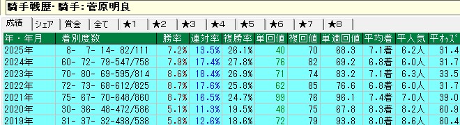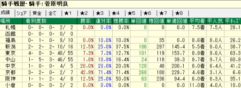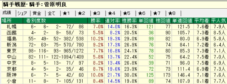 後回しになったが菅原の成績を見てみようか。いまだに戸崎圭太が馬質にモノを言わせて幅を利かせているが、菅原明良もなかなかのもの。これだけでも十分乗れる騎手だが、足かせとなっているのが中山の成績。