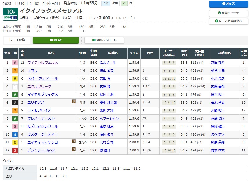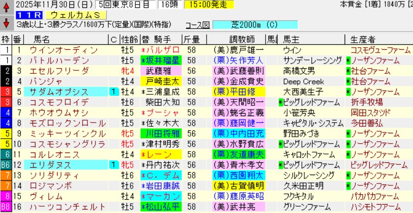 東京11RウェルカムS(3勝)芝2000