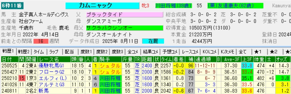 当のカムニャックはキタサンブラックを彷彿させる父ブラックタイド×母父サクラバクシンオーという距離延びて歓迎の血統。新馬戦の映像を見てもスケール感のありそうな勝ち方をしており、実際にG1勝ちでポテンシャルの高さを証明してみせた。