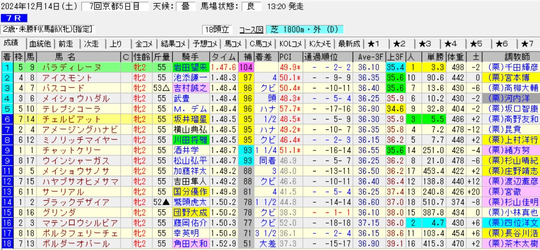 うーん、パラディレーヌっていい馬だな。丹内祐次じゃなければもっといいのに。圧勝した未勝利戦とつばき賞は2番手から楽抜け出し。強気な積極策の方が持ち味が生きるタイプかもしれない。