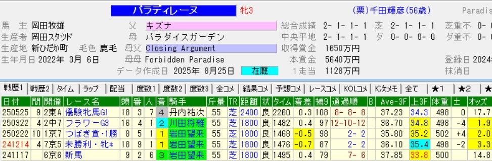 とはいえ、本馬はフラワーCで5着に敗れただけでなく、前走の1勝クラスですら2着では厳しい。血統の魅力は、父エピファネイア×母ミッキークイーンで超良血でも完成はまだもう少し先の気がする。
