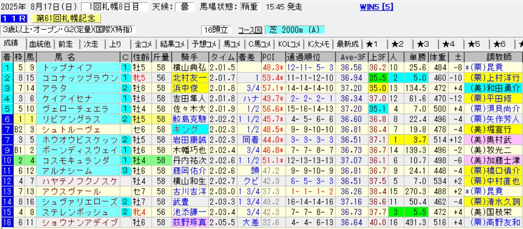 横山典弘の天才的なインマクりが炸裂した札幌記念(G2)。前も後ろも関係なく普通に負けた。これといって見せ場もなく敗戦した。コスモキュランダは10着大敗も、中山専用機なら気にするほどじゃない。