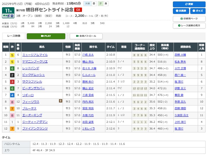 15日敬老の日に行われた菊花賞トライアル・セントライト記念(G2)は、戸崎圭太と初コンビを組んだミュージアムマイル(牡3、栗東・高柳大輔厩舎)が1番人気に応えて優勝。皐月賞馬が秋初戦でも格の違いを見せつけた。
