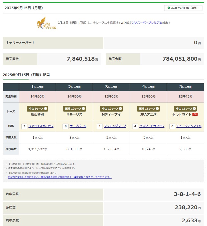 1倍台が連敗した関係で想定16万円から20万円に増え、これにスーパープレミアムの10%3万円が追加されて23万8220円。8番人気ヤマニンなら10%の増え幅が激増するから200万円に届くだろうという予想です。