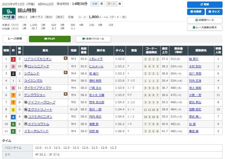 モレイラ騎乗の1番人気リアライズカミオンが、単勝1.9倍の断然人気に応えて7馬身差の大楽勝。直線入り口でも手応えの違いが明白で、直線半ばでモレイラが外をチラ見する余裕もあった。