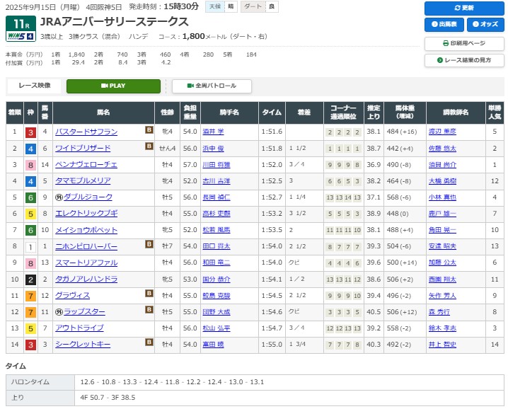 阪神11RJRAアニバーサリーS(3勝)ダ1800