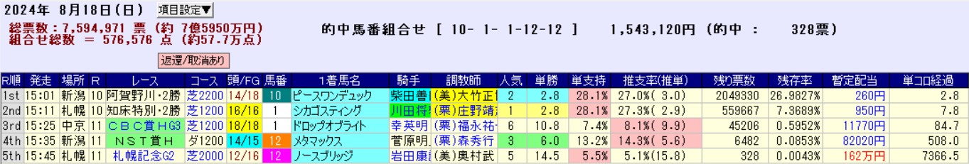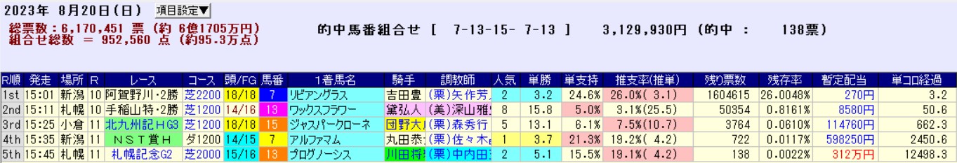 とはいえ、こうして振り返ってみても荒れ放題の夏WIN5に翻弄されっぱなし。芝は1-2番人気、ダートは4-5番人気が強い傾向を把握したものの、5つのピースをピタリとハメる難しさは痛感させられた。