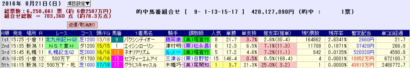 まあそんなことより、4つ目で単勝万馬券の15番人気まで勝っていたにもかかわらず、キャリーオーバーとならずに的中1票があったことだ。この頃から既に予想を放棄した富豪買いに手を染めている層がいた事実の方が怖い。