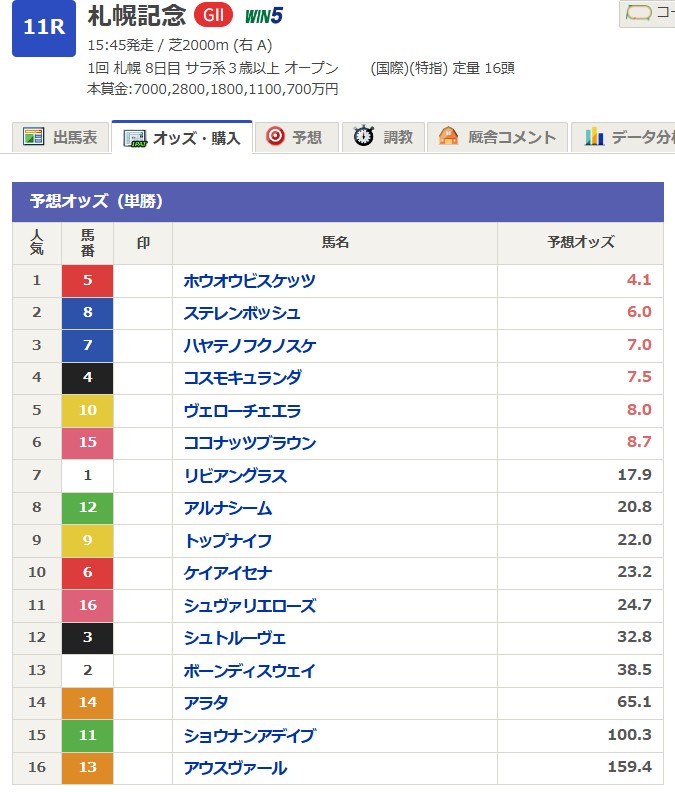 札幌記念 何も考えずに上から5頭(5点)
