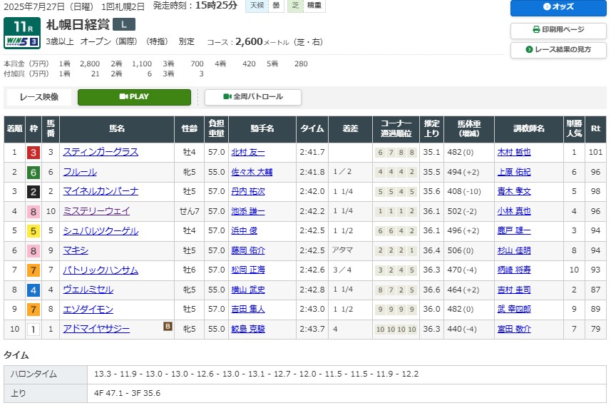 勝ちタイムは2分30秒2(良)。1/2馬身差の2着にC.ルメールの1番人気スティンガーグラス、アタマ差の3着に入ったのは岩田望来の3番人気ディマイザキッド。9→1→3番人気で決着した3連複の払戻は1万11560円、3連単は10万1470円の大波乱となった。