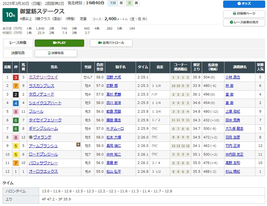 それを見つけるのが人気に振り回されない予想でもあり、穴馬券の攻略法ではなかろうか。少なくともミステリーウェイの前走を見ていれば、ノーマークはリスクしかない。仮に1着はないと思っても、2着3着に残る予想はするべきである。