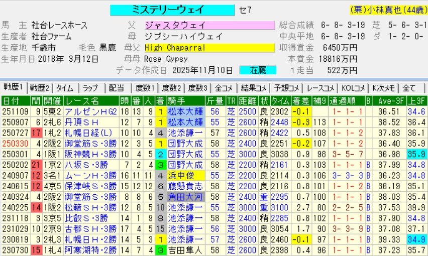 ミステリーウェイは社台ファーム生産でジャスタウェイ産駒。通算成績はこれで36戦6勝。7歳秋にして初の重賞タイトルを手に入れた。