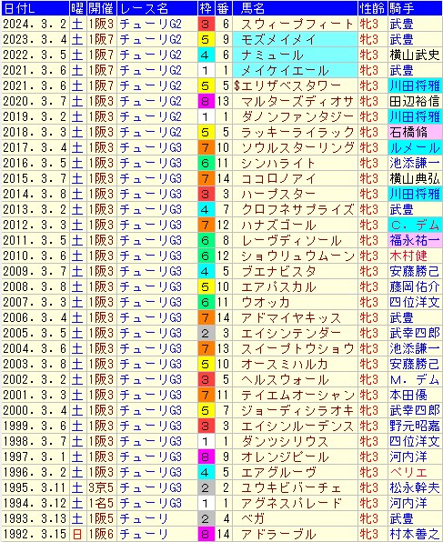 というのもチューリップ賞に土曜阪神のイメージが根強いからだ。試しに確認してみたところ、過去33年は土曜で今年は日曜。さらに遡ると1992年までは日曜の開催だったらしい。タイミング的に二冠馬ベガの優勝した翌年からG3となり、それから33年もの間、土曜のメインレースとして親しまれていた。