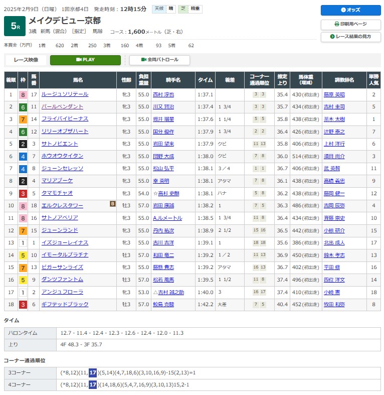 当初は遅い勝ち時計と上がり35秒4で印象に残らなかったものの、手応えに余裕を残したまま2着に1馬身3/4の差をつけていた。あと、特筆すべきはL1のラップを11秒3でまとめていること。スローの上がり勝負となった展開でL3は12秒4-12秒0-11秒3の加速ラップ。他馬も加速している中で明確な着差をつけてゴール前で流していたのだから価値がある。