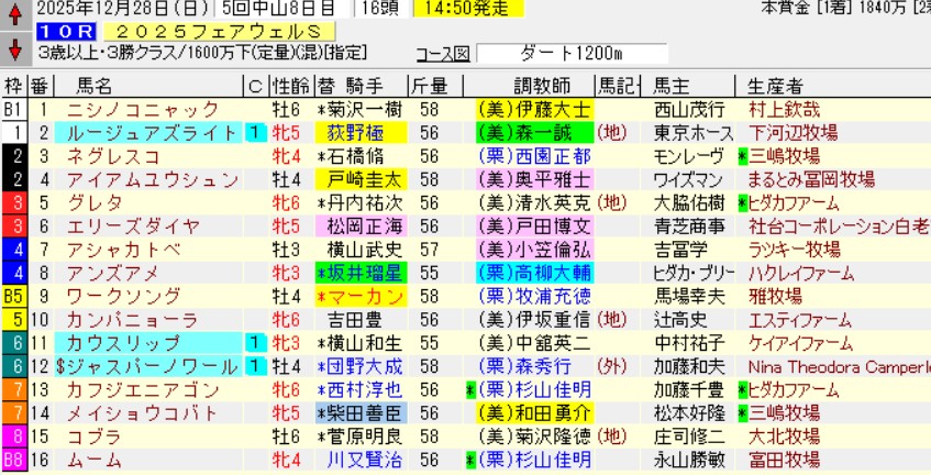 中山10RフェアウェルS(3勝)ダ1200