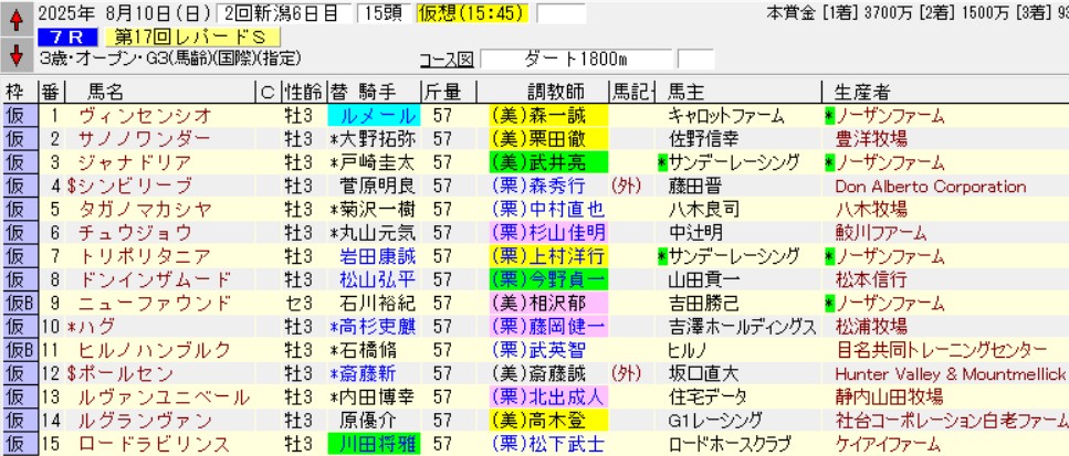 かといって今年のメンツは、近年でも稀に見る低さである。一応重賞ということで、前走2勝クラスを勝った馬でもカフジオクタゴンやメイショウムラクモしか勝てなかったのだが、今年はルグランヴァンただ1頭が該当する程度。うーん、どうだろうか。