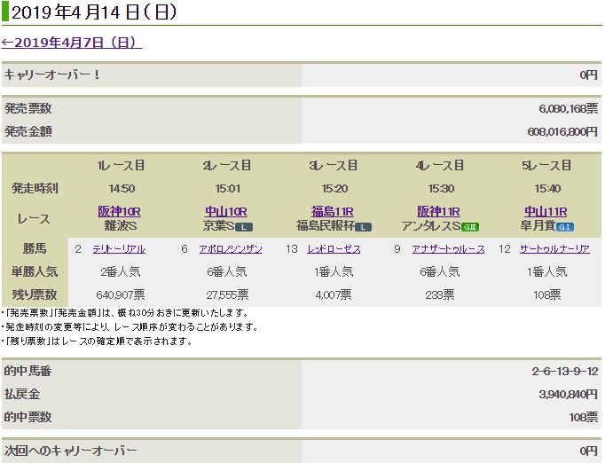2-6-1-6-1人気と大荒れしている訳でもないが394万と高配当。 しかもラストのサートゥルナーリアは1倍台の圧倒的支持。 それほどつかないとタカをくくっていたがこれは驚いた。 難波S、京葉S、福島民報杯が荒れやすい傾向で警戒していたのだが、荒れたのは京葉Sのみで難波Sと福島は平穏決着。 アンタレスSはウェスタールンドとグリムで人気を分け合ったが伏兵アナザートゥルース。 京葉Sのアポロノシンザン、アンタレスSのアナザートゥルースの支持率が6%前後だったこともあってここで大量に死亡。 人気が割れずに上位人気に集中していたために実質6人気以上の波乱となっている。 芝の断然人気は疑えというのがWIN5のスタンスのため、普段なら平穏なダートが荒れていずれも6人気だったのが高配トリガーとなった。 今週は京都、東京の比較的難易度が下がる開催なのだが、こちらも傾向としては荒れ放題。 どのレースが荒れるのかの選定に苦労しそうだ。