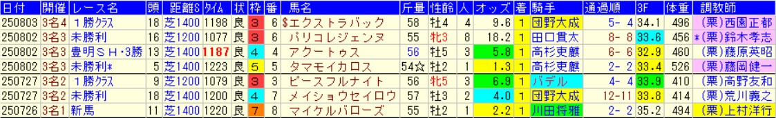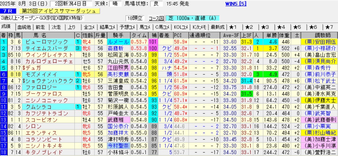 先週のアイビスサマーダッシュ(G3)には、昨年優勝のモズメイメイ、2着ウイングレイテスト、3着テイエムスパーダの3頭が揃って出走し、結果は2番人気ピューロマジックが驚異的な上がり31秒3の切れで優勝した一方、テイエムスパーダが2着、ウイングレイテストが3着、モズメイメイが6着に入った。