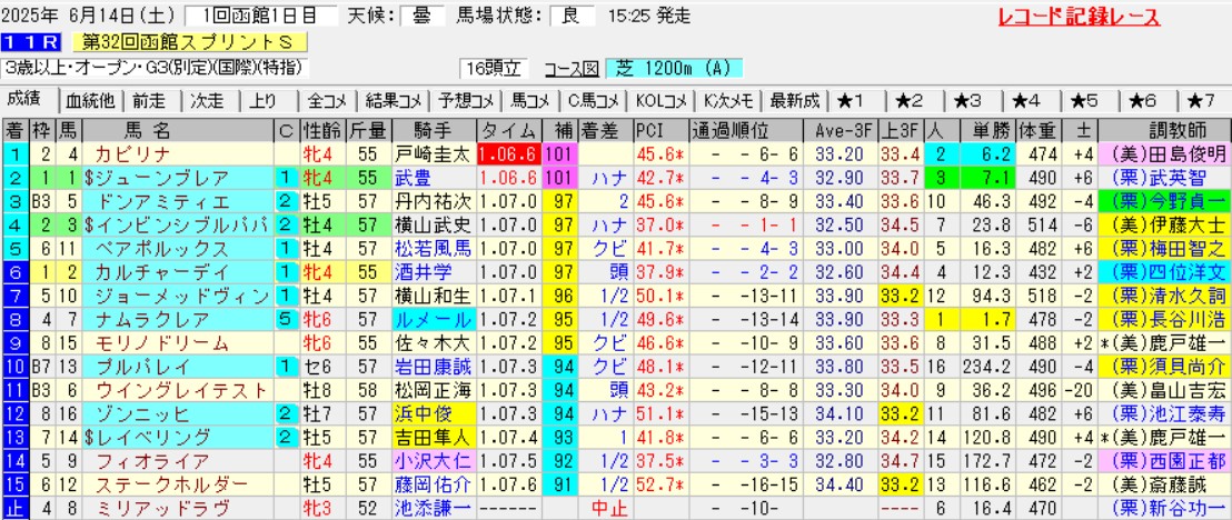 近年の北海道開催は、本当に洋芝なのかと疑うほどの高速決着が頻繁にある。ただ前にいたから残っちゃいましたのインビンシブルパパを評価する必要もなく、重巧者のカルチャーデイも同様。ジューンブレアのみでいいだろう。前後半3Fを32秒9-33秒7でまとめるだけの実力があれば問題ない。