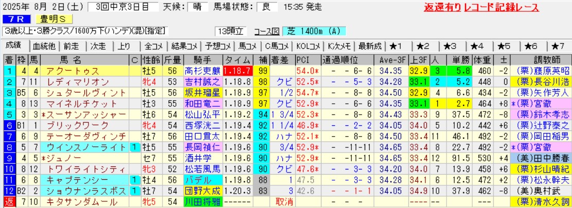 逃げ馬天国の先入観を持ってレースを見ると真逆。勝ったアクートゥスはWIN5でもお馴染みの馬だが、キャリア初の32秒台を計時。ちなみに過去最速も中京芝1400mの中京スポニチ賞(2勝)でマークした33秒2だった。