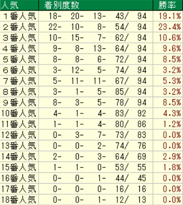 もちろん、11番人気以下の大穴だって来るだろうさ。それでも今年の対象レースで11Rの人気別着順成績が以下。
